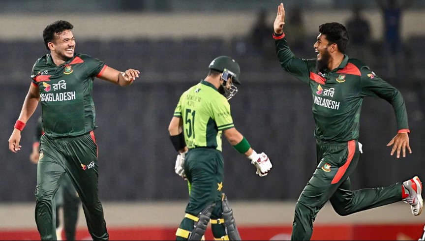 সিরিজ নির্ধারণী তৃতীয় ওয়ানডে ম্যাচে ২৯১ রানের টার্গেট দিয়ে শুরুতেই পাকিস্তানের ব্যাটিং স্তম্ভ ভেঙ্গে দেন বাংলাদেশের পেসাররা। এরপর একাই দলকে টানেন সালমান আলি আগা। পাকিস্তানকে জয়ের দ্বারপ্রান্তেই নিয়ে যান তিনি। কিন্তু শেষদিকের রোমাঞ্চে ১১ রানে জিতে যায় বাংলাদেশ। তাতেই ২-১ ব্যবধানে সিরিজও জিতলেন মেহেদি হাসান মিরাজরা। এর মাধ্যমে পাকিস্তানের বিপক্ষে ওয়ানডেতে টানা সিরিজ জেতার নজিরও গড়ল বাংলাদেশ। সবশেষ ২০১৫ সালে একে অপরের বিপক্ষে দ্বিপাক্ষিক সিরিজ খেলেছিল বাংলাদেশ-পাকিস্তান। সেবার পাকিস্তানকে ৩-০ ব্যবধানে হোয়াইটওয়াশ করেছিল বাংলাদেশ। রান তাড়া করতে নেমে শুরুটাই ভালো হয়নি পাকিস্তানের। বাংলাদেশের দুই পেসার তাসকিন আহমেদ ও নাহিদ রানার দাপুটে বোলিংয়ে শুরুতেই তিন উইকেট হারিয়ে চাপে পড়ে সফরকারীরা। মাত্র ১৭ রানেই হারায় প্রথম তিন উইকেট। ইনিংসের প্রথম ওভারেই সাহিবজাদা ফারহানকে (৬) ফেরান তাসকিন। পরের ওভারে নাহিদ রানা আউট করেন মাজ সাদাকাতকে (৬)। আর নিজের দ্বিতীয় ওভারে এসে রিজওয়ানকে (৪) ফেরান তাসকিন। চাপে পড়া দলের হাল ধরার চেষ্টা চালান গাজি ঘুরি ও আব্দুল সামাদ। তবে প্রতিরোধটা ভালোভাবে করতে পারেননি তারা। ৩৯ বলে ২৯ রানে ঘোরি ও ৪৫ বলে ৩৪ রানে সামাদ আউট হন। একশর আগেই ৫ উইকেট হারিয়েছিল পাকিস্তান। বিপদের সময় দলের হাল ধরেন সালমান আলি আগা। তাকে সঙ্গ দিয়ে যাচ্ছিলেন সাদ মাসুদ। অভিষিক্ত এই ব্যাটার দারুণ শুরু পেয়েছিলেন। তবে ৩৮ রানে তাকে থামিয়েছেন মুস্তাফিজ। দুর্দান্ত ডেলিভারিতে বোল্ড করেন এই বাঁহাতি পেসার। তাতেই ৭৯ রানে থামে সালমান-মাসুদ। ক্রিজে নেমে দেখে-শুনেই খেলছিলেন ফাহিম আশরাফ। সালমানের সঙ্গে আরেকটি জুটি গড়ার প্রয়াস চালান তিনি। কিন্তু সেই সুযোগ দেননি তাসকিন আহমেদ। বাঁহাতি এই ব্যাটারকে বোল্ড করে সাজঘরে পাঠান তিনি। আউট হওয়ার আগে ৯ রান করেন ফাহিম। বাংলাদেশের সবচেয়ে সফল বোলার তাসকিন আহমেদ। একাই চারটি উইকেট নেন তিনি।
